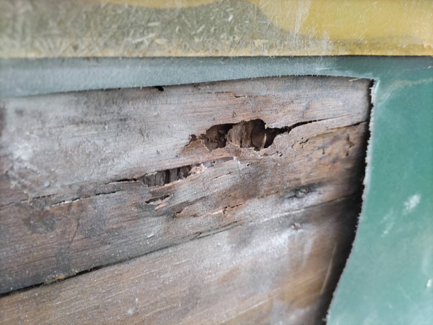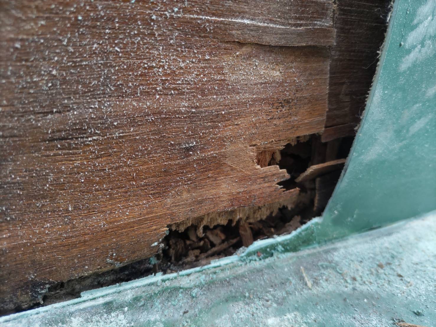 当社ホームページより公式ラインにて雨漏りのお問い合わせありがとうございます。画像を添付していただき、洗面器に雨水が溜まっている状態でした。1階脱衣室の天井からの雨漏りでその上はバルコニーとのことで日程を合わせて現場調査へお伺いさせていただき、雨の入っている侵入ヶ所が数か所考えられる為すべての侵入ヶ所を潰して施工計画書を作成してご提案させて頂きました。シート防水を剝がしたら下地が腐っている状態でした。