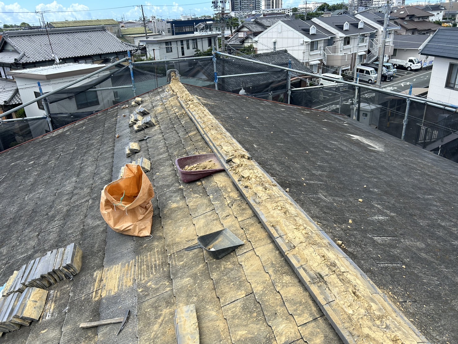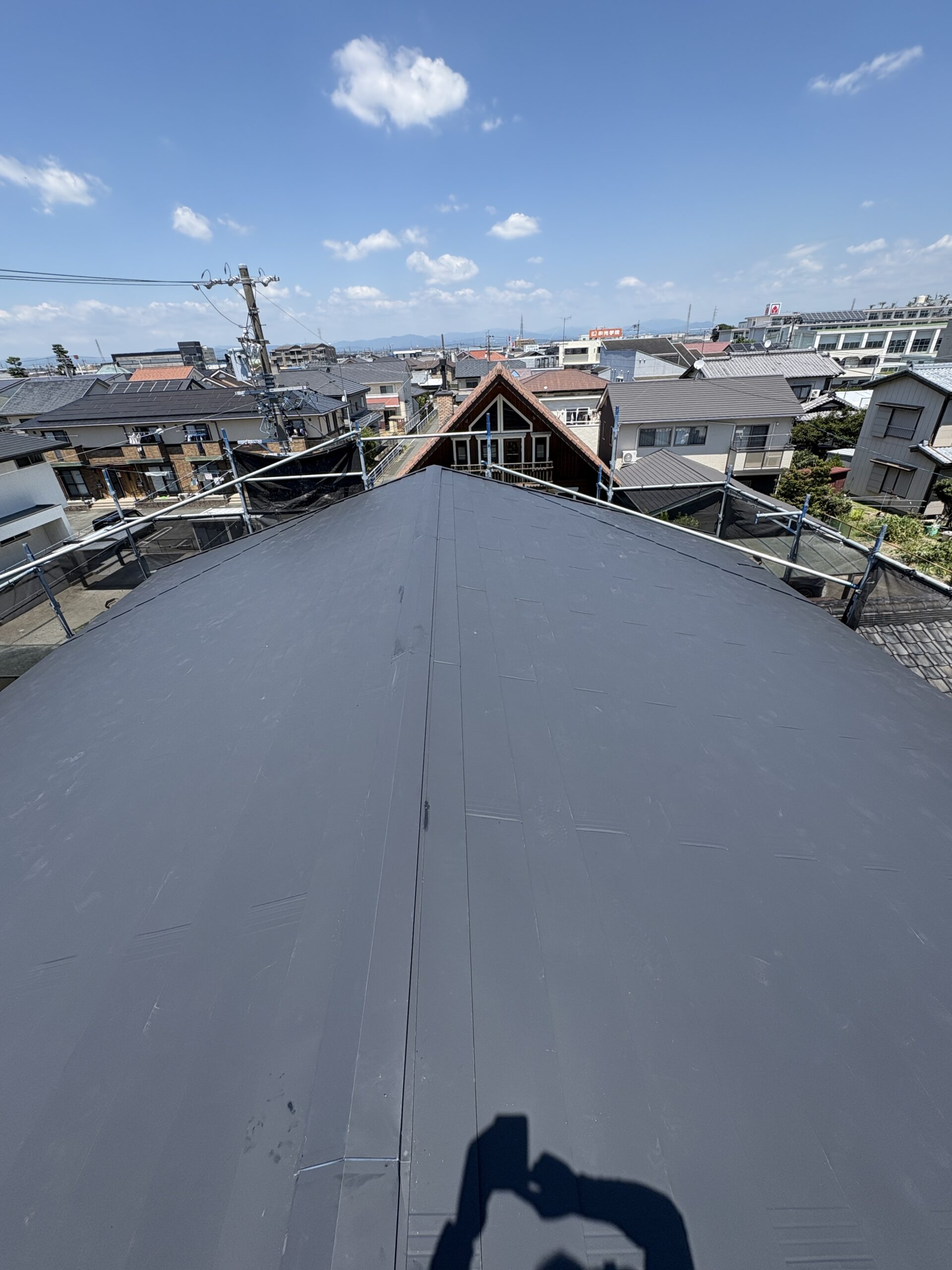 今回のご依頼はお施主様のお向かいのにある介護施設の職員さんが屋根の部材が剝がれていることを教えてくださったとのことでした。数年前に離れの建物の雨漏り工事を当社で施工させて頂いたお施主様で、一度見に来てほしいとご連絡くださいました。現場調査へ行き状況を確認してカバー工法工事をご提案させて頂きました。