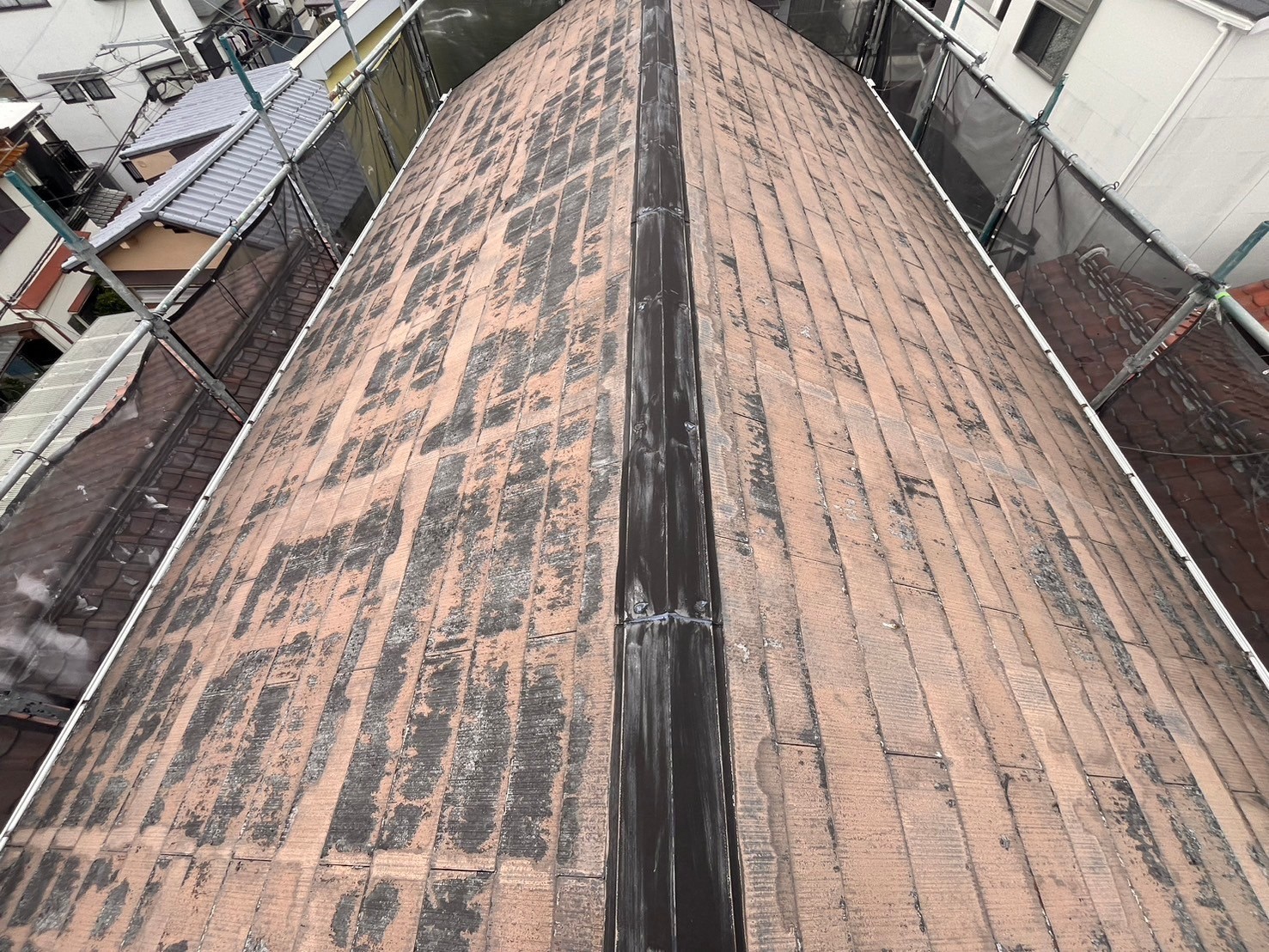 下地処理: スレート表面のコケやカビを高圧洗浄機で除去。その後、必要箇所に補修材を使用し、下地を整えました。