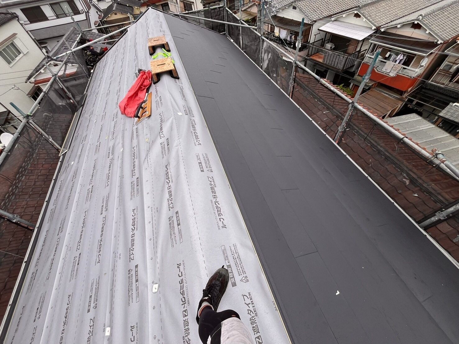 スーパーガルベストの取り付け: スレート屋根全体に防水シートを敷き、その上からスーパーガルベストを固定。金具とネジでしっかりと留め、風や地震などによるズレを防ぎます。