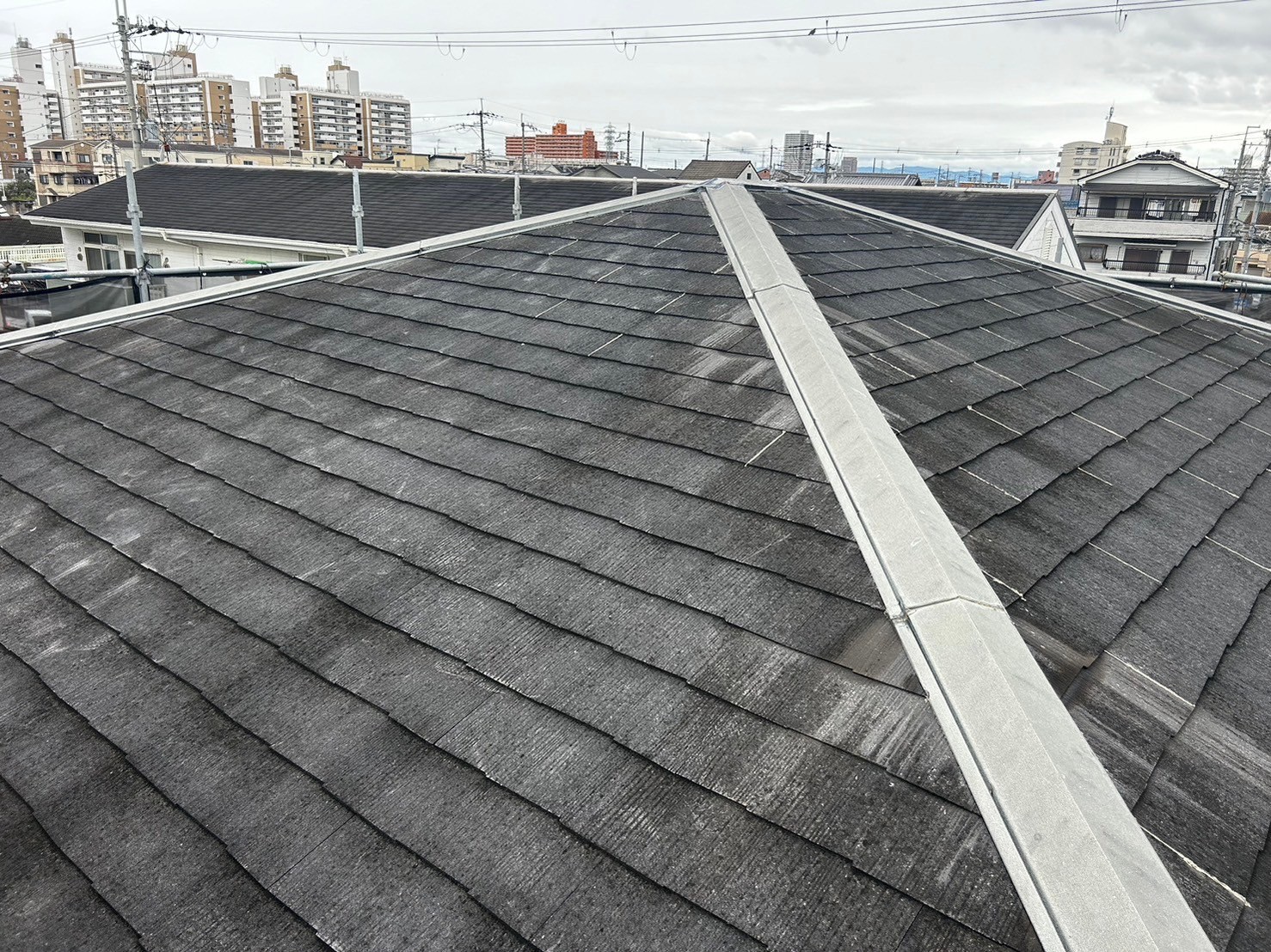 仕上げ作業 最終的に、屋根全体のチェックと仕上げを行いました。新しいスーパーガルベストは、見た目が美しく、モダンな印象を与え、家全体が新しくなったような雰囲気を醸し出しました。また、雨樋の清掃と修理も同時に行い、排水機能も改善されました。