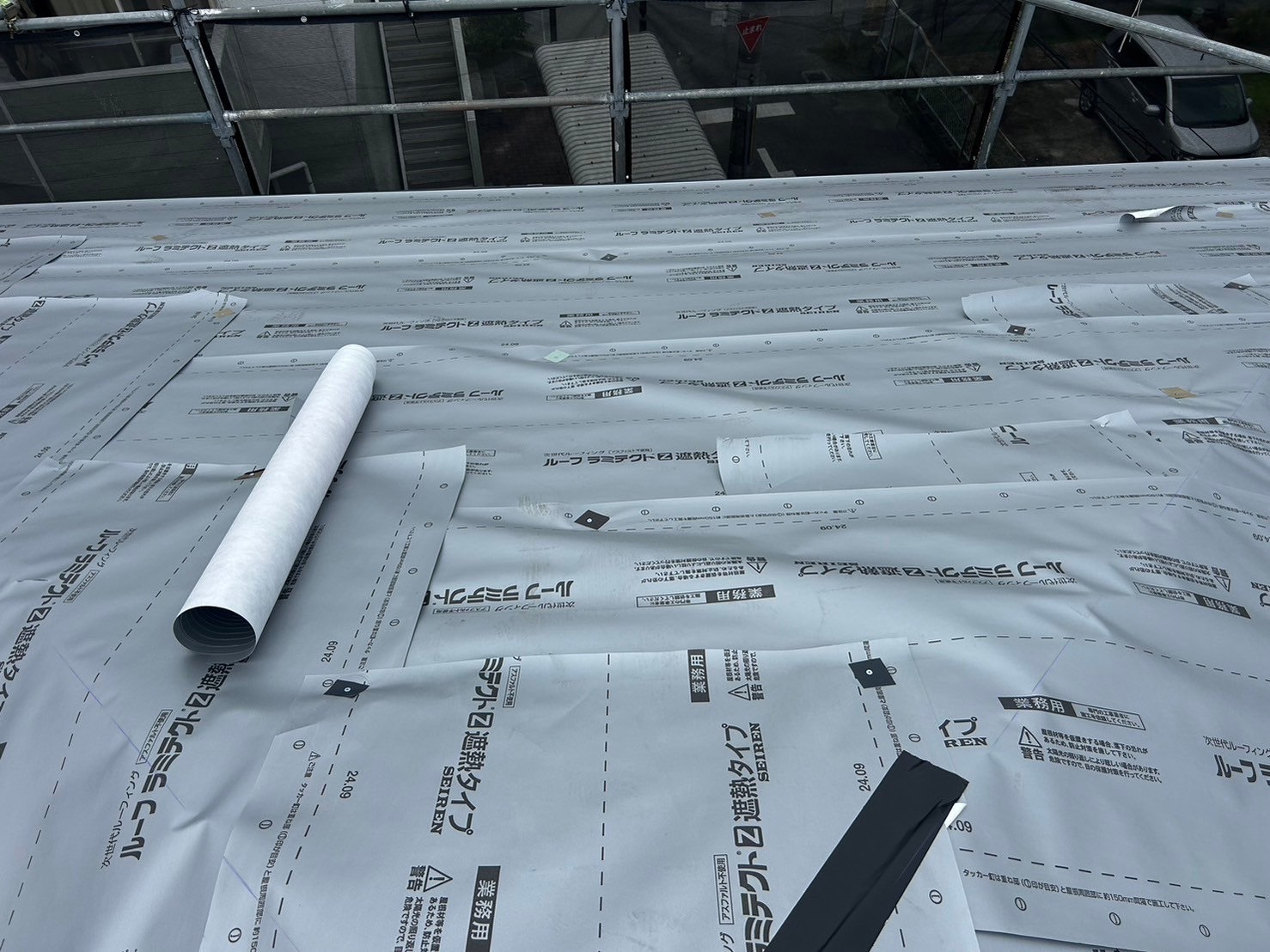 防水シートの施工 既存の屋根材を撤去せずに、上から防水シートを敷設するカバー工法を採用しました。防水シートは、雨水が建物内に浸入するのを防ぐ重要な役割を果たし、スーパーガルベストの耐久性と相まって長期的な防水効果を発揮します。