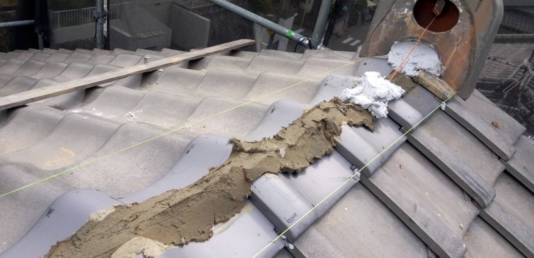 雨漏りの原因を特定するために、屋根全体の現地調査を実施しました。棟瓦の劣化とずれ、そして一部の瓦の破損を確認しました。