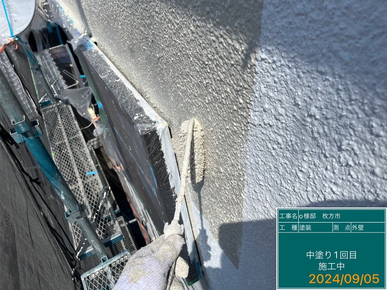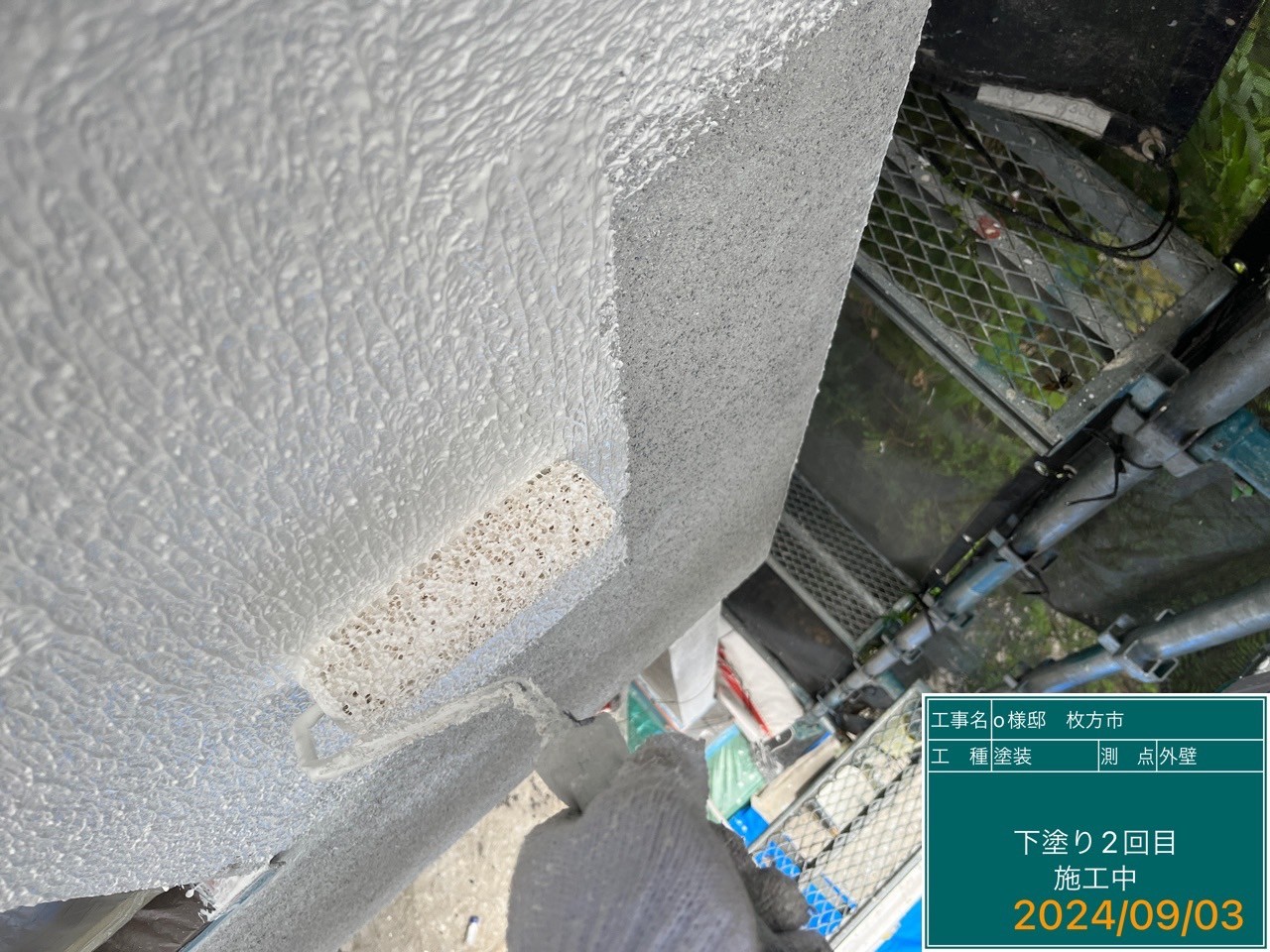 外壁塗装の下地作りとして、専用の下塗り材を使用しました。これにより、上塗り塗料の密着性を高め、塗膜の耐久性を向上させました。